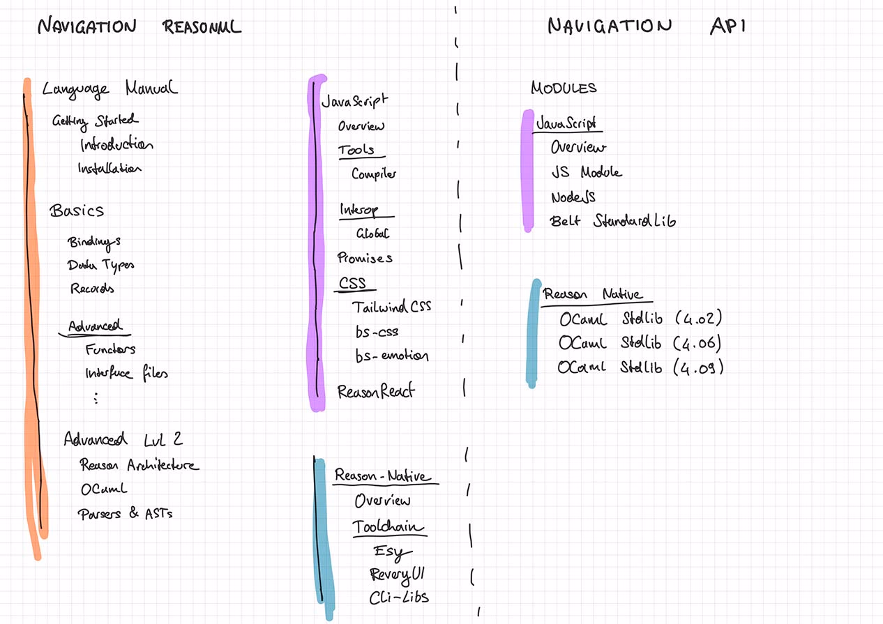 Surprisingly for us, the navigation and sitemap turned out to be the hardest part to figure out. We had to craft long-lived URLs that would work across multiple versions of the Reason compiler and standard library, had to do research about future localization possibilities, understand the guts and limits of different documentation tools such as docusaurus, find a way to enable component based theming, and then put everything in a layout that actually worked across all sorts of devices without being too cluttered or confusing.